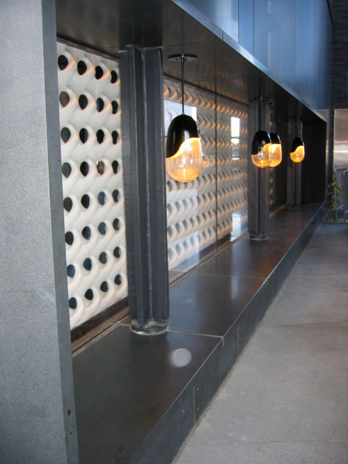 The faux-historical structure along the street mimics the local vernacular with its brick facade and steel canopy. It "repairs" the urban fabric, but seems like a wasted opportunity.