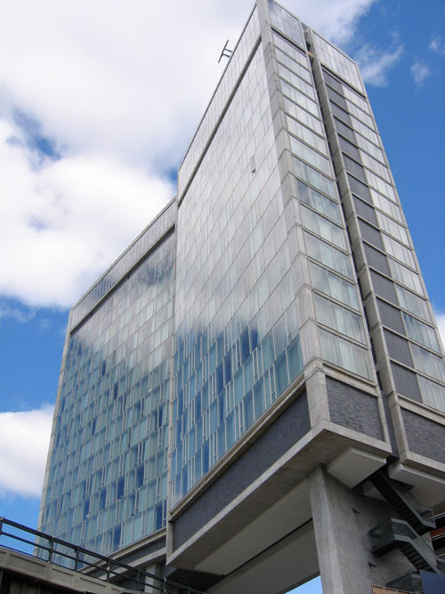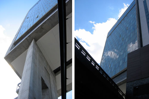 OK, a few words to orient: The Standard New York is the fourth hotel in the boutique chain from Andre Balazs (I'm partial to the one in downtown Los Angeles... I like the pseudo-corporate overtones of the former oil company headquarters... but anyway). The NYC incarnation is located in Gansevoort Market--more commonly called The Meatpacking District. It is the first ground-up structure built as a Standard Hotel and is the creation of New York firm Polshek Partnership Architects.