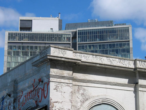 Other aspects of the project are not as convincing. While the monumental gestures and distant vistas are impressive, some of the more intimate pedestrian experiences reveal the design's weakness. The opportunity to explore the contrasting relationship of the modern vocabulary of the tower as it meets the ground plane and wraps beneath the High Line at the lobby is largely squandered. There are a few nice moves to highlight the contrast between old and new, but the architecture of the lobby feels divorced from the tower. But my disappointment with the design comes mainly from choice to insert an uncomfortably faux-historic brick structure partially beneath the High Line to the south of the main entry. It is meant to look like an adaptive reuse of an existing structure; like an organic piece of the urban fabric absorbed into the project. But it isn't. Rather it is a lazy element of the design meant to "blend" with the surrounding streetscape and heighten the effect of the modern tower hovering above. I get it... but I think it is a missed opportunity. And just to bitch some more, the inset veneer of brick on the lower section of the tower seems a bit gratuitous...