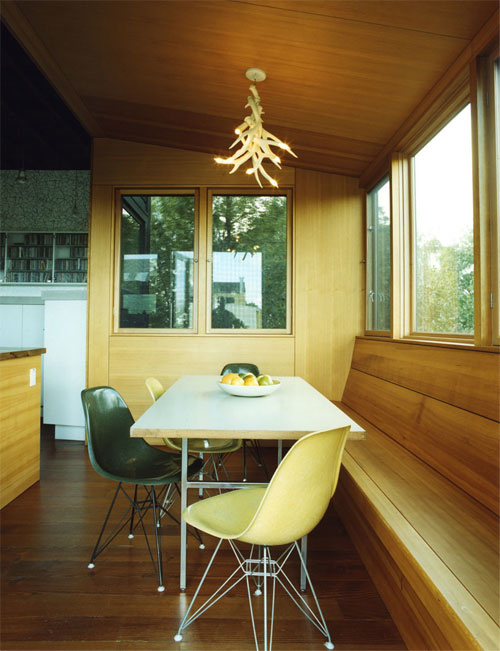 Upstairs, the newly opened space developed into kitchen/living/dining space. The floor and the ceiling were pared back to its rough surfaces, exposing the gabled roof volume with its rough-sawn collar ties and raw redwood wood boards of the underside of the roof. The original douglas fir subfloor was extensively patched and left raw. The kitchen was designed with only lower cabinetry to allow spatial continuity between the shared functions of the room. The cabinets’ hemlock veneer lowers and a large central island with a reclaimed black walnut top define the working space of the kitchen. A single long shelf cantilevers from the new window wall, replacing what typically would have been solid upper cabinets, creating an ideal display shelf for Claire’s collection of Dutch and American designer glassware and porcelain. A dining nook—articulated as a wood box clipped onto the larger gabled living space—has hemlock veneer plywood walls that warp into a comfortable bench extending across the back wall. At the other end of the room, an informal sitting area, with its lower center of gravity, is inflected in plan to allow for casual TV viewing. A tapered wall of white cabinetry draws the line of the entry / hallway wainscoting into the room, collecting the flat screen TV and housing both pantry and media. Above the line of the high gloss wainscot, Erica Wakerly reflective wallpaper extends the light at the back of the house all the way to the front door.